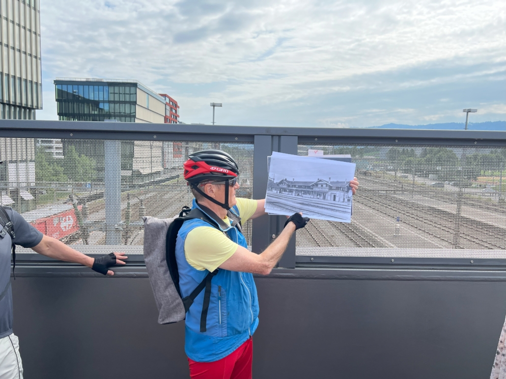 Beim Bahnhof Rotkreuz stellten wir uns auf die neu erstellte Fussgänger-Überführung und erfuhren, dass Rotkreuz 1882 zu einem wichtigen Knotenpunkt für den Güterverkehr wurde. Und das ist ja auch immer noch so.