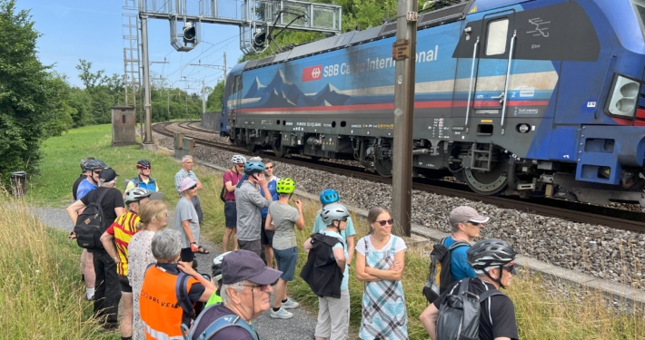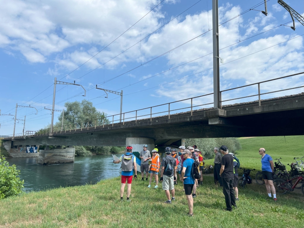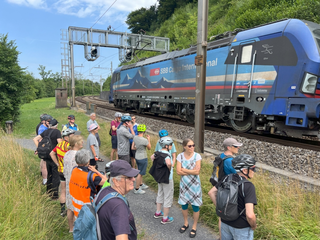 Nach einer kurzen Fahrt zur Brücke über den Geleisen bei Zweiern wurden wir von zwei durchfahrenden Zügen mit lauten Pfiffen begrüsst. Freude herrschte über diese Aufmerksamkeit!