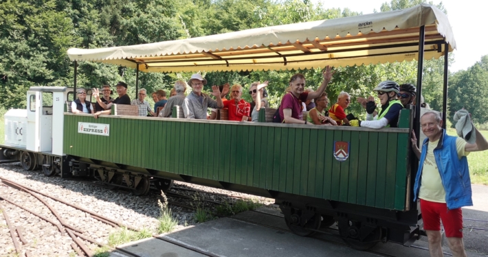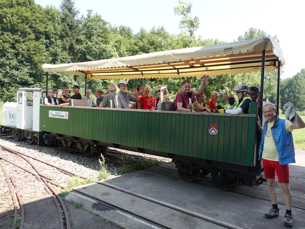 Auf der anderen Seite radelten wir teils auf Schotterwegen Richtung Körbligen. Dort bei der Ziegelei Schumacher AG befand sich die letzte Station der Velotour und es erwartete uns eine Überraschung. Martin Stuber hatte eine Fahrt mit der Feldbahnlokomotive in einem offenen Personenwagen zur nahegelegenen Lehmgrube der Ziegelei organisiert. Der Lokführer Ueli Wenger erzählte uns mit viel Herzblut und Wissen von der Geschichte der Feldbahn, die das Rohmaterial bis zum heutigen Tag transportiert.